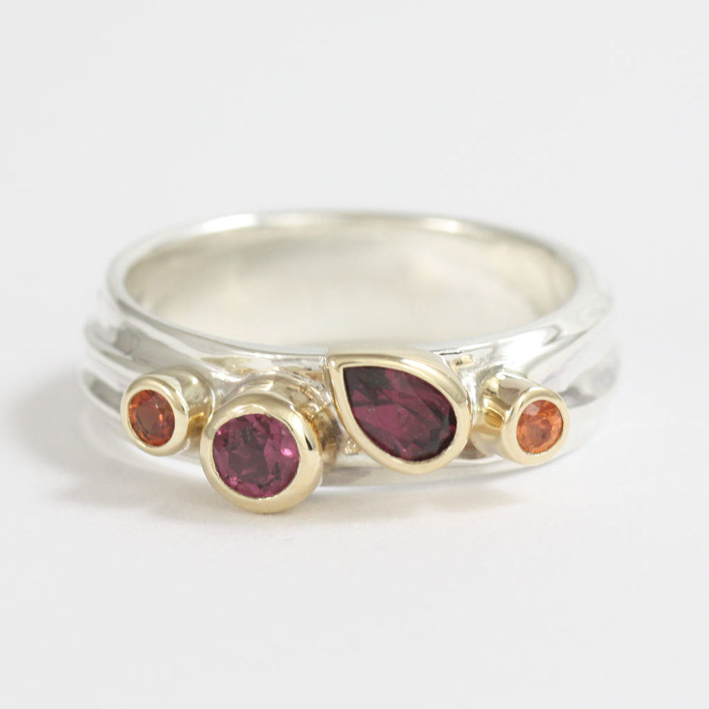 Silver, Gold, Sapphire and Rhodolite Garnet Ring