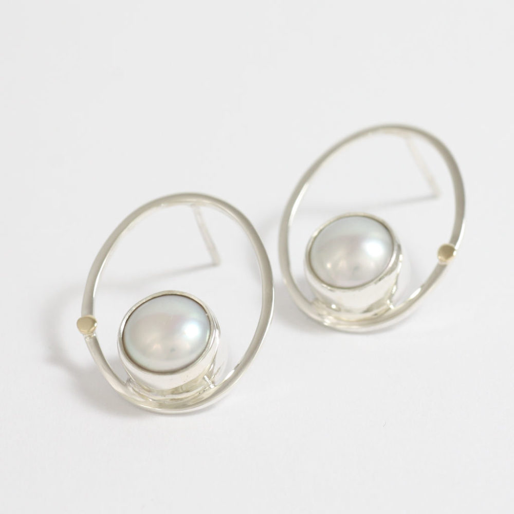 Silver, Gold, Garnet and Pearl Oval Earrings