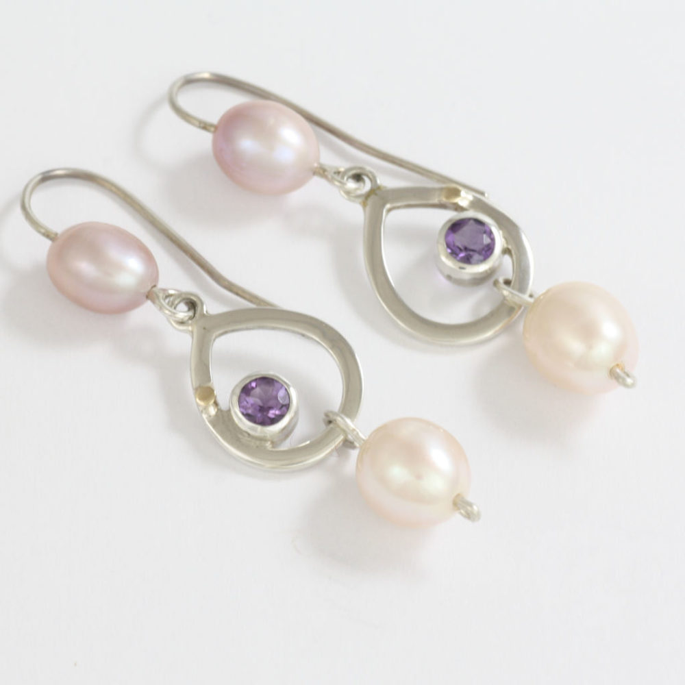 Silver, Gold, Amethyst and Pink Pearl Earrings