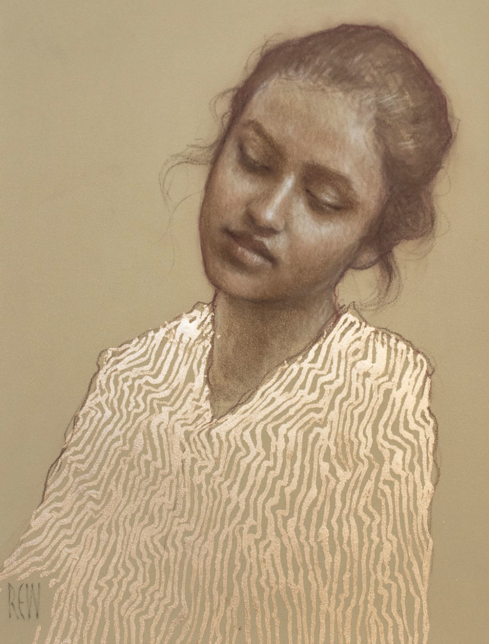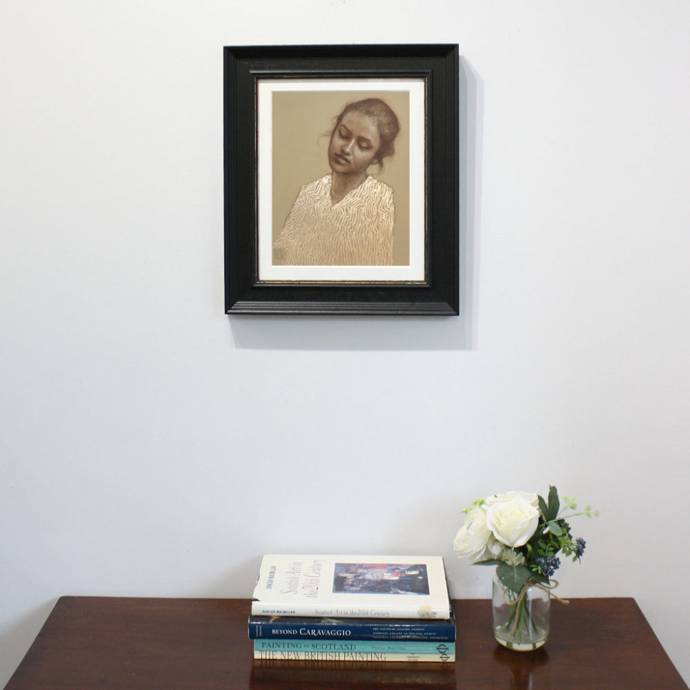 Stephanie says: “Pattern, colour and texture of textiles and costume are intrinsic to my work, giving the painting a tactile and dramatic element, placing the model in a timeless era. Tone and form, as well as strong light and colour is important to me, as I concentrate on the juxtaposition of tonality and texture whilst keeping a private, reflective mood with the work.