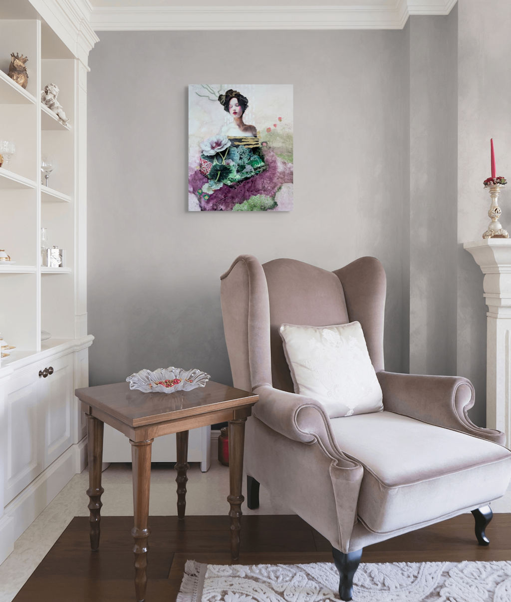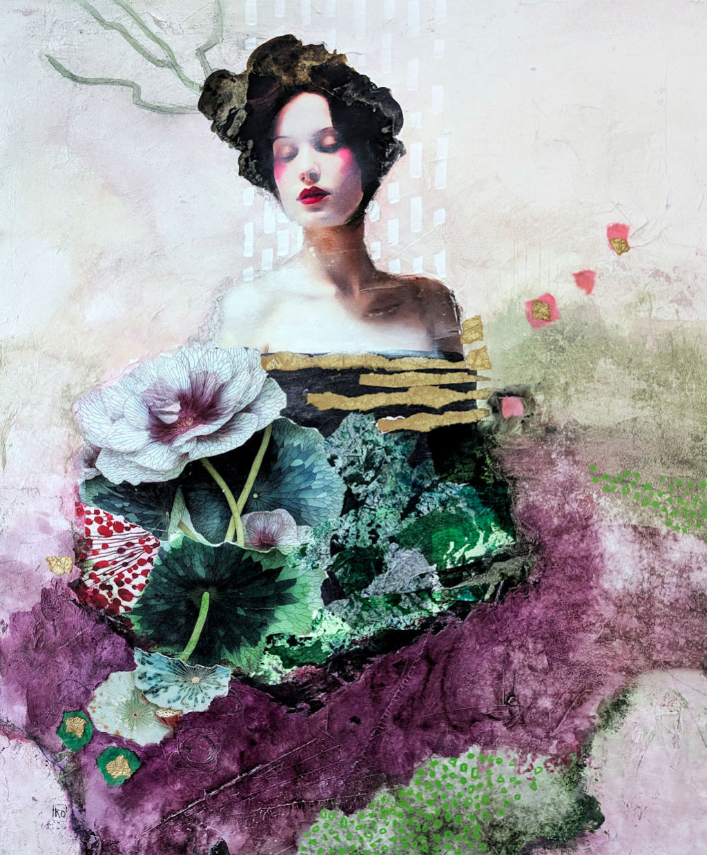 Inspired by the golden sensuality of Gustav Klimt, the diaphanous grace of Marie Laurencin, and the refined elegance of Japanese art, I work with very diluted acrylic paint, while also exploring mixed media techniques. I incorporate collages of paper, photographs, and Japanese paper into my creations, enriching the textures and poetic resonances of my compositions.