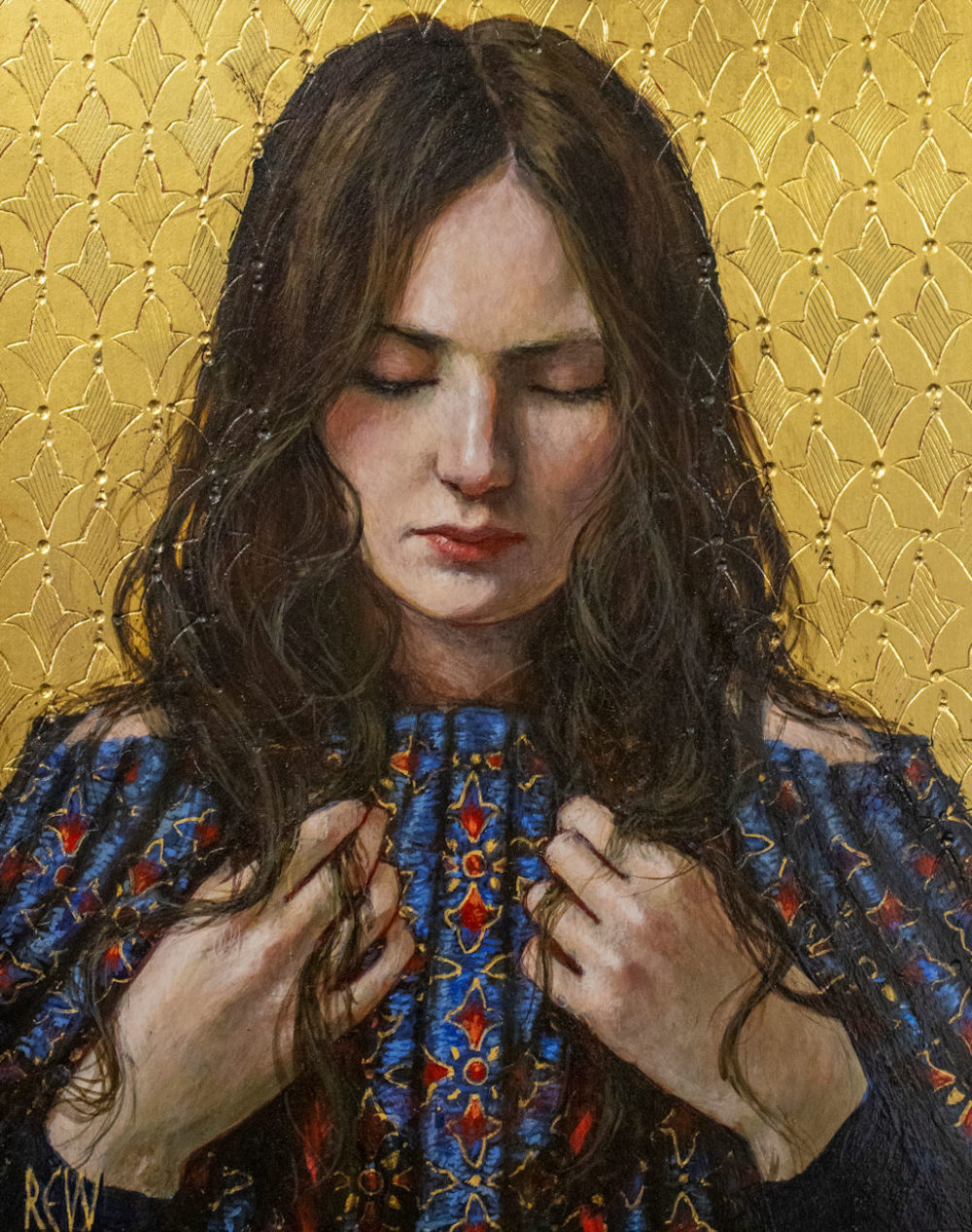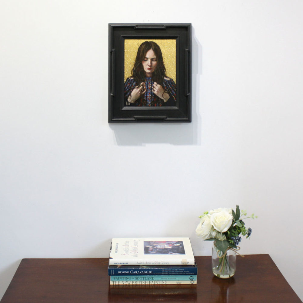 Stephanie says: “Pattern, colour and texture of textiles and costume are intrinsic to my work, giving the painting a tactile and dramatic element, placing the model in a timeless era. Tone and form, as well as strong light and colour is important to me, as I concentrate on the juxtaposition of tonality and texture whilst keeping a private, reflective mood with the work.