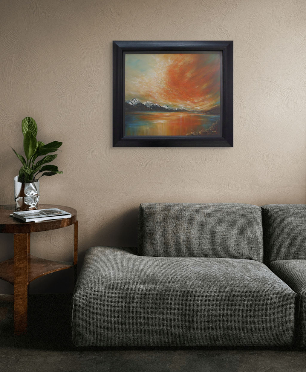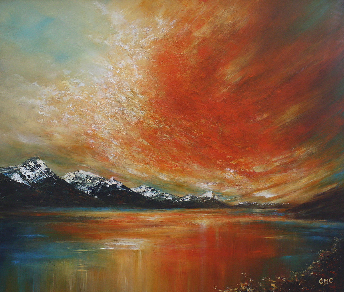 Inspired by the colours, textures, patterns and a pure love of Scotland and it’s natural beauty, she tries to capture the ethereal and ever-changing light and atmosphere of the landscape. She paints mostly in acrylics using palette knives, hake brushes and at times, just her fingers. She tries to bring energy and movement into the work by building up layers of paint that makes for a textural surface. Then the magic begins – the painting starts to emerge and sometimes it is like the painting has almost painted itself.