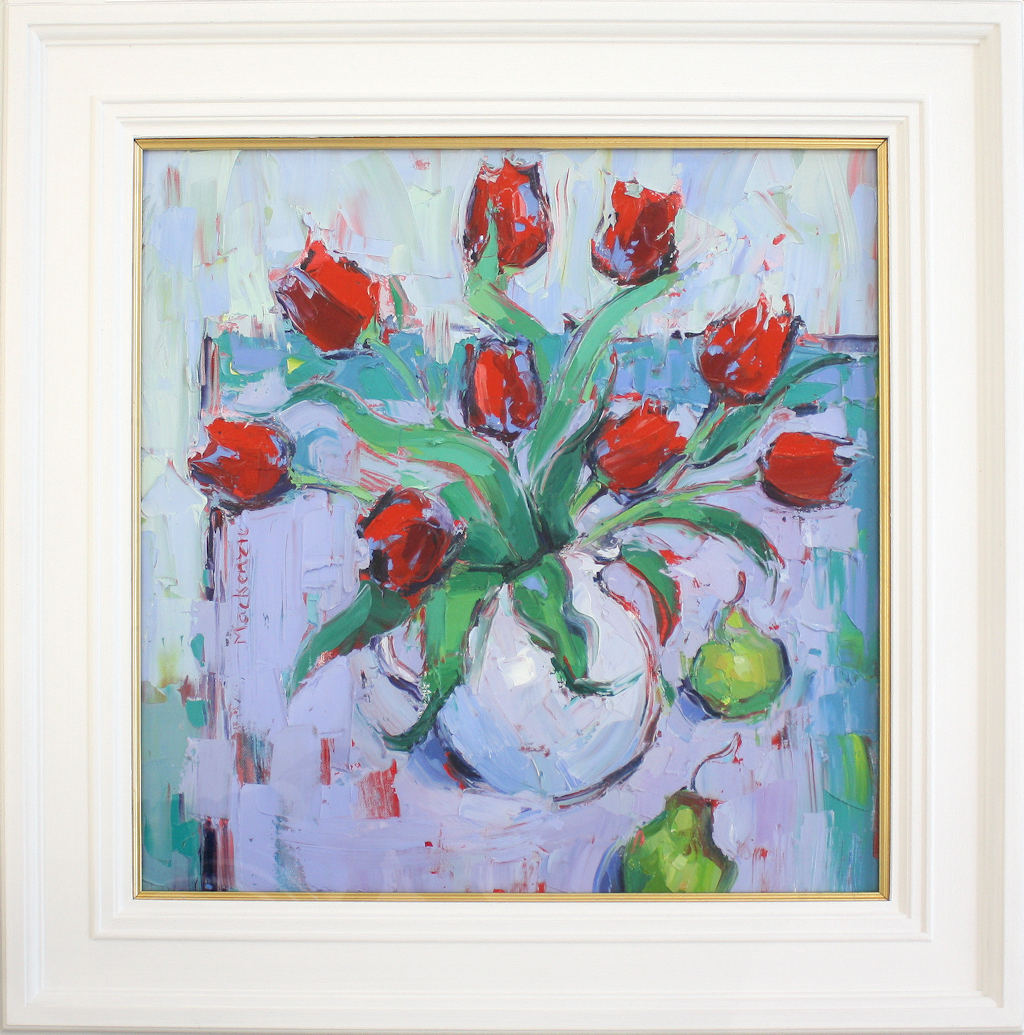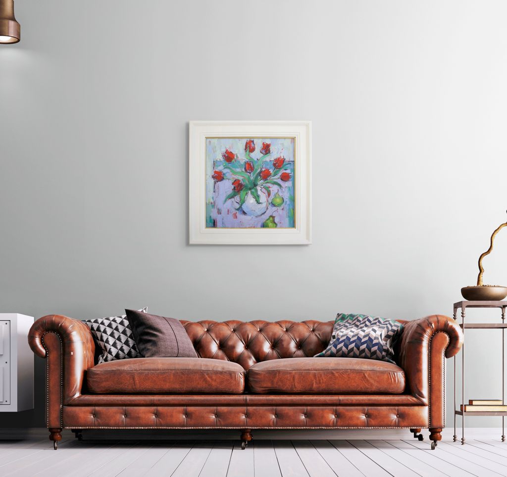 She says: “My paintings are very much a personal response to my environment, in terms of colour, light and space, and in the Scottish painterly tradition, reflecting my time at GSA with tutors such as William Drummond Bone, Sandy Goudie, and David Donaldson. My paintings explore the distinctive characteristics of oil paint through my favoured subject matter of flowers and collected objects in my studio”.