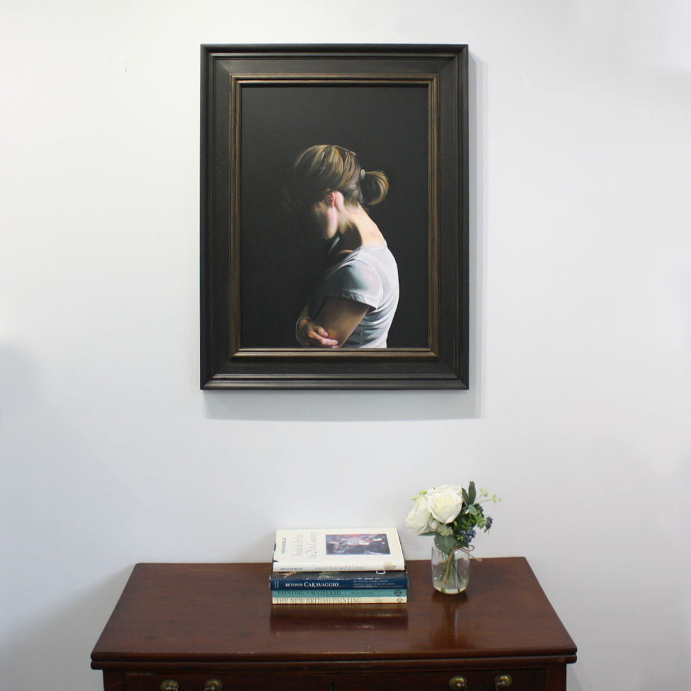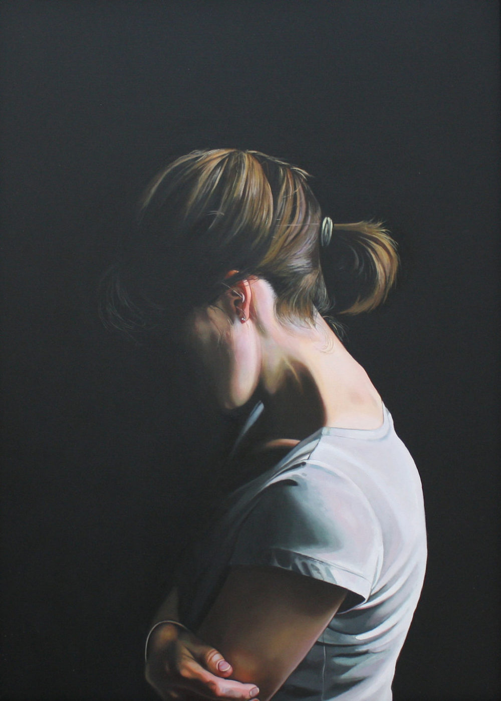 She has exhibited her paintings widely and has shown very successfully at art fairs in London and Glasgow. Using recognisable subject matter she employs an intense realism in her paintings, whether still life or portraits. Subjects have a luminescence and clarity that make them appear as if they could move off the canvas. Jane says, “I started painting the figure while at art college — mainly self-portraits or members of the family, usually on large canvases with the figure placed off centre to create an image of vulnerability. Pattern and surface are tools that I use to explore how the dominance of appearance manipulates the identity.”