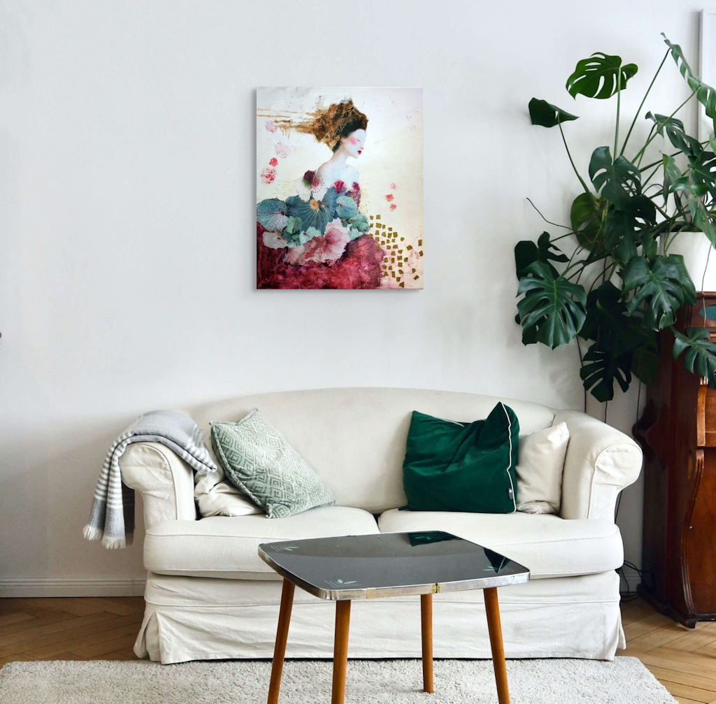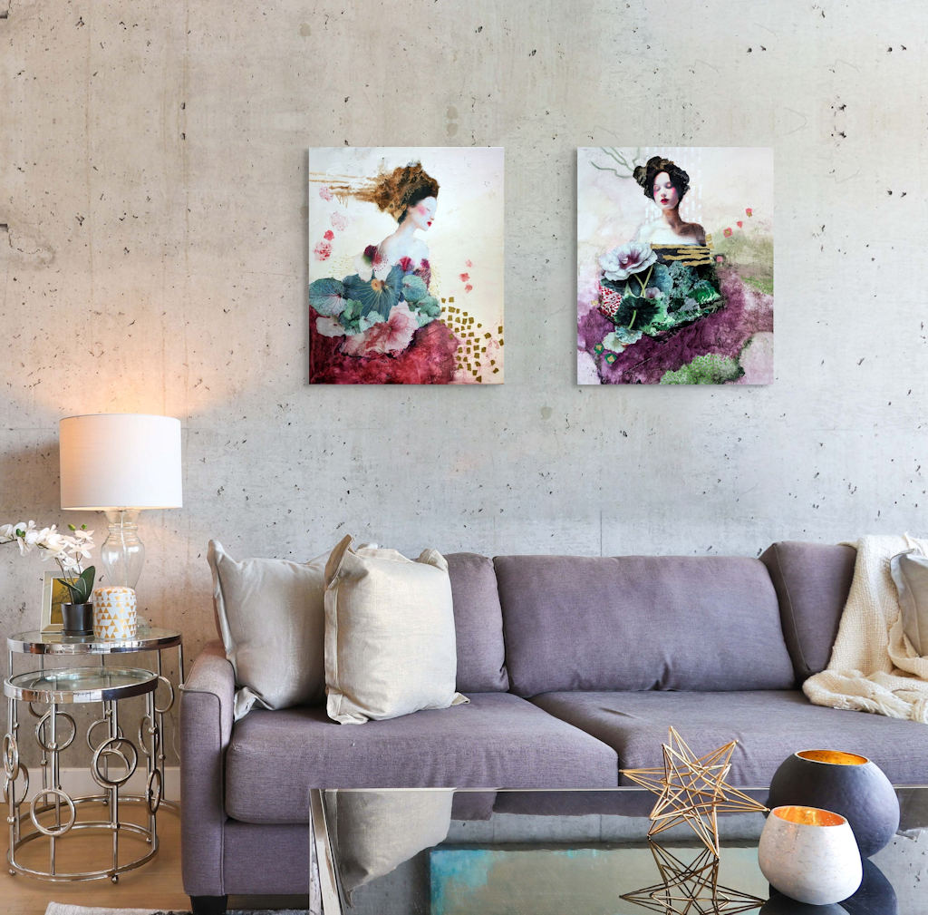 Inspired by the golden sensuality of Gustav Klimt, the diaphanous grace of Marie Laurencin, and the refined elegance of Japanese art, I work with very diluted acrylic paint, while also exploring mixed media techniques. I incorporate collages of paper, photographs, and Japanese paper into my creations, enriching the textures and poetic resonances of my compositions.