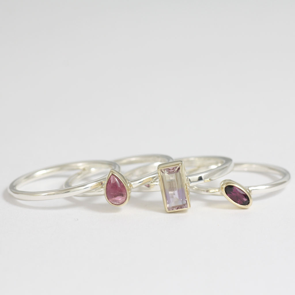 Set of Four Silver, Gold, Ametrine, Tourmaline and Garnet Rings