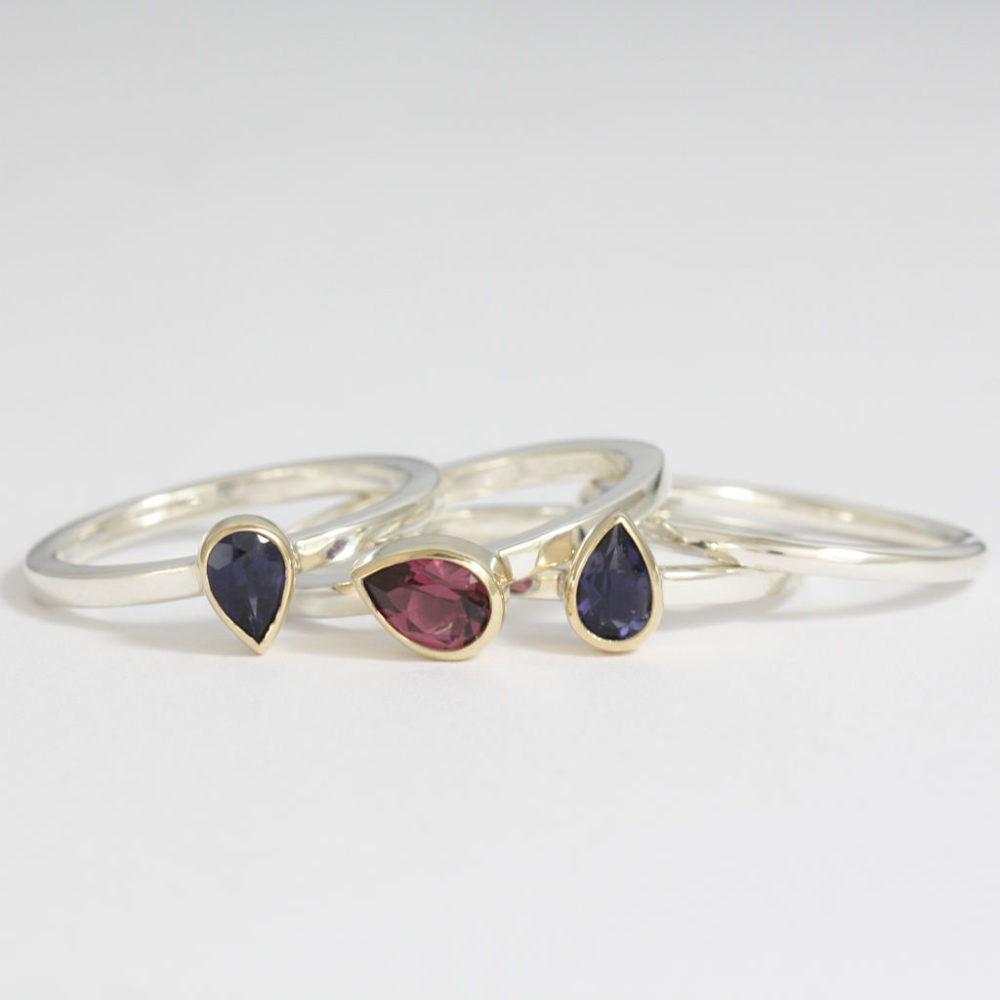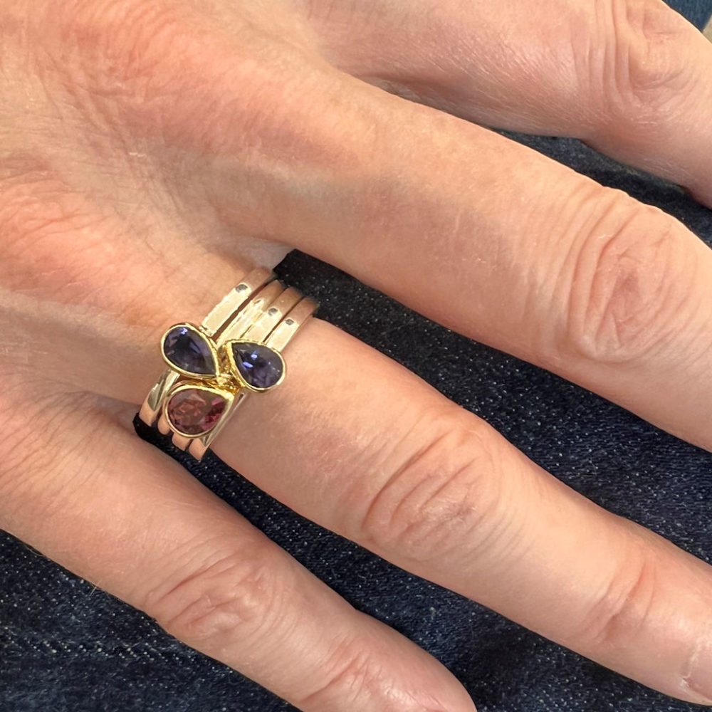 Set of Four Silver, Gold, Iolite and Rhodolite Garnet Rings