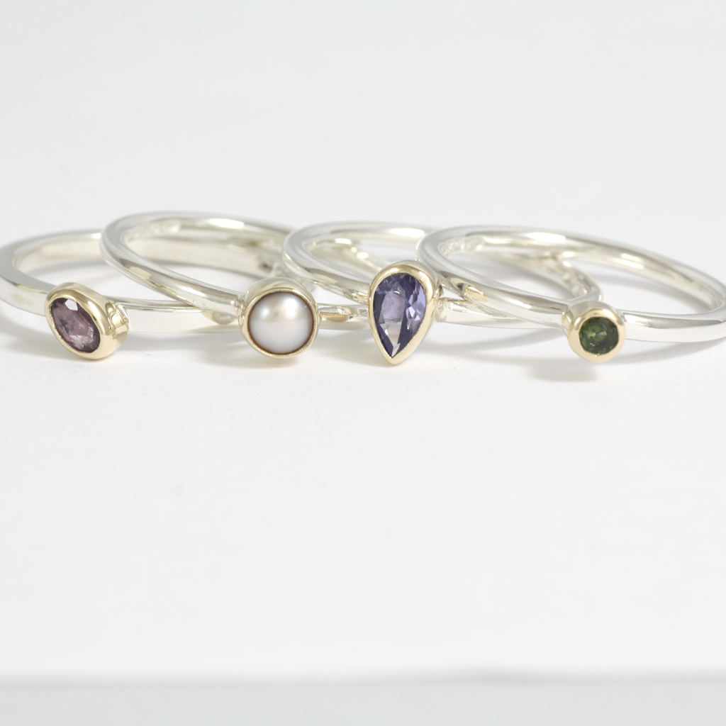 Set of Four Silver, Gold, Tanzanite, Pearl and Tourmaline Rings