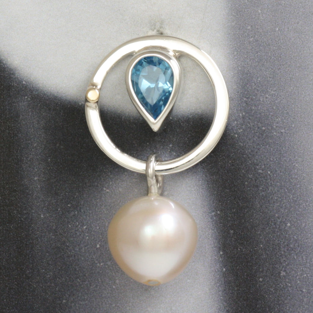 Silver, Gold, Blue Topaz and Pink Pearl Circle Earrings