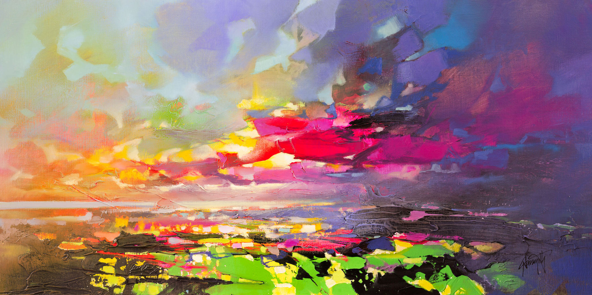 Scott Naismith’s recent work concentrates on transitional skies and the many colours involved when light breaks through cloud. These changing skies from dark to light are a metaphor for optimism and hope. After a miraculous recovery from cancer by his father, recent marriage and birth of his 2 children, Scott draws upon a great positivity and energy.