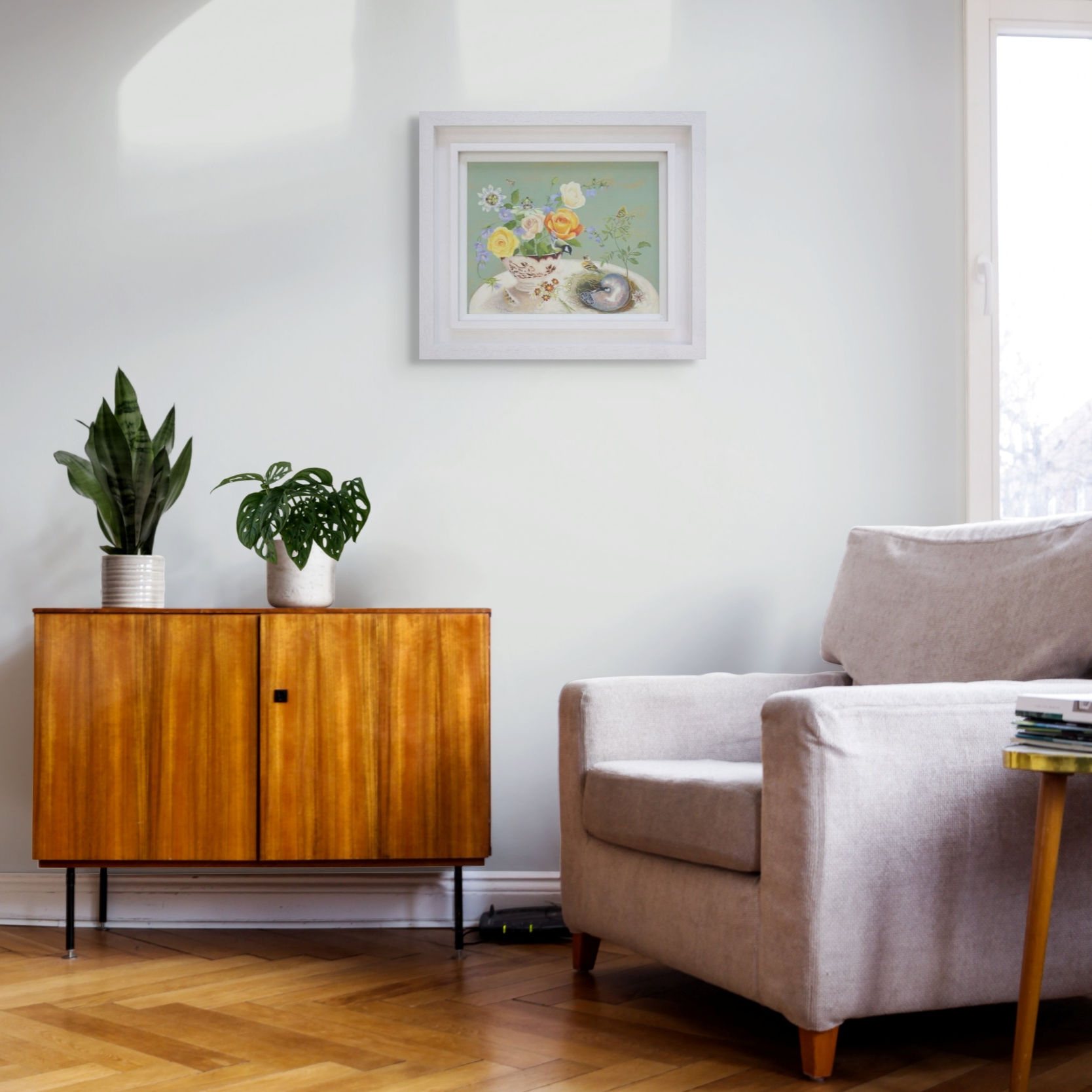 Lesley says: “My paintings reflect the fascination I have with the natural world, mostly that which surrounds me in my immediate environment. I live in the Scottish Borders, where the landscape and light is beautiful and varied – a rich source of inspiration, from Belted Galloway cattle to Scottish Blackface sheep, barn owls to wrens. I live in a small community beside a busy farm where there is an abundance of subjects to paint. As well as the Scottish landscape, animal and bird life I have a love of indoor objects of beauty too, such as precious momentos and collections…private wee secrets. I often scour my friends’ homes, armed with my camera! As well as my own creations I also enjoy private commissions, when the client specifies their favourite objects, flowers and colours. With my window scenes I try to bring the outside in so that there is a merging of environments; perhaps a blackbird or barn owl who tries his luck or a creeping vine meandering towards the window sill. A large bouquet of flowers deepens the link between interior and exterior. Usually a table holds carefully placed individual objects, each with its own story to tell, but also part of the whole coming together of the scene. There’s an entire lifetime of inspiration in all the things I love.