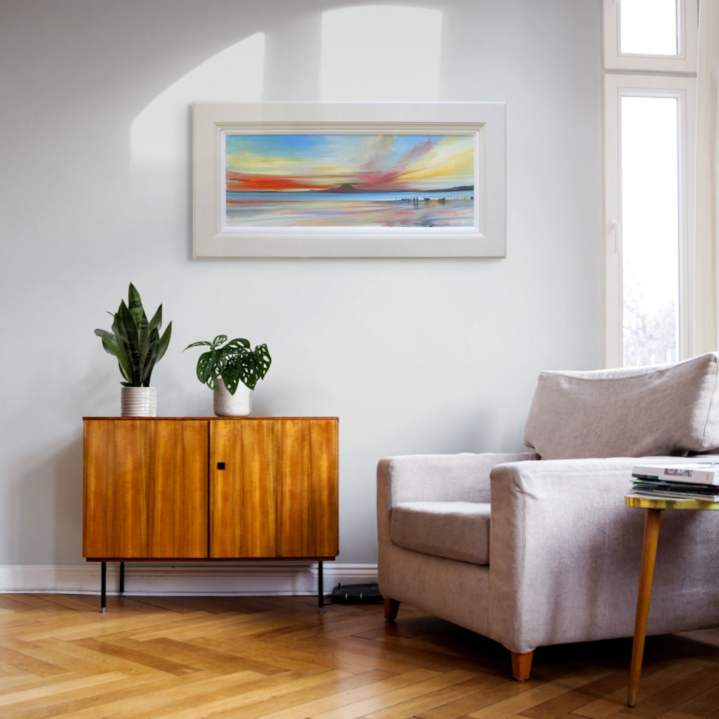 Heightened colours of sunrise, sunset, amidst calm and storm; simplified shape and blending lines are the basis of her distinctive abstract style.