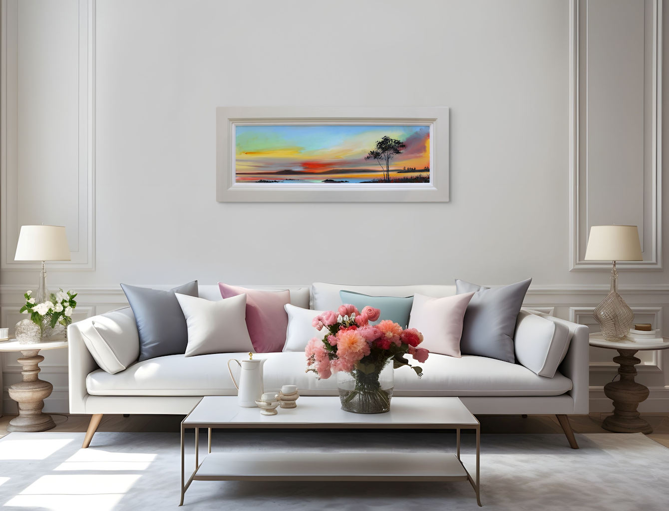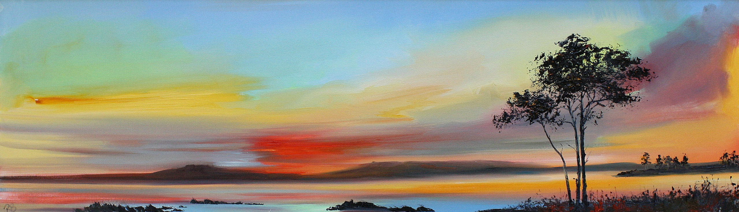 Heightened colours of sunrise, sunset, amidst calm and storm; simplified shape and blending lines are the basis of her distinctive abstract style.